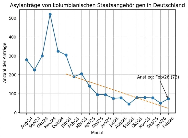 Die Analyse der Zahlen für Februar 2026 zeigt einen Anstieg der von kolumbianischen Staatsangehörigen in Deutschland gestellten Anträge auf internationalen Schutz.